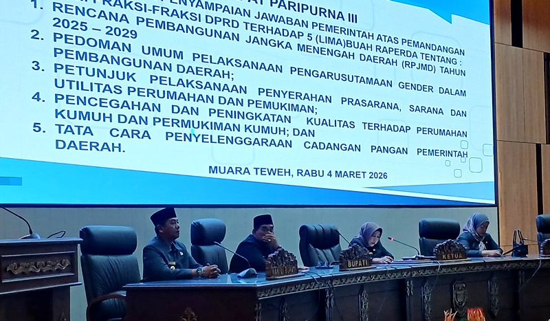 WARTABARITO.ID, Muara Teweh – Pemerintah Kabupaten Barito Utara terus memperkuat landasan hukum pembangunan daerah melalui pembahasan lima Rancangan Peraturan Daerah (Raperda) strategis dalam Rapat Paripurna III Masa Sidang I Tahun 2026 di Gedung DPRD setempat, Rabu (4/3/2026).