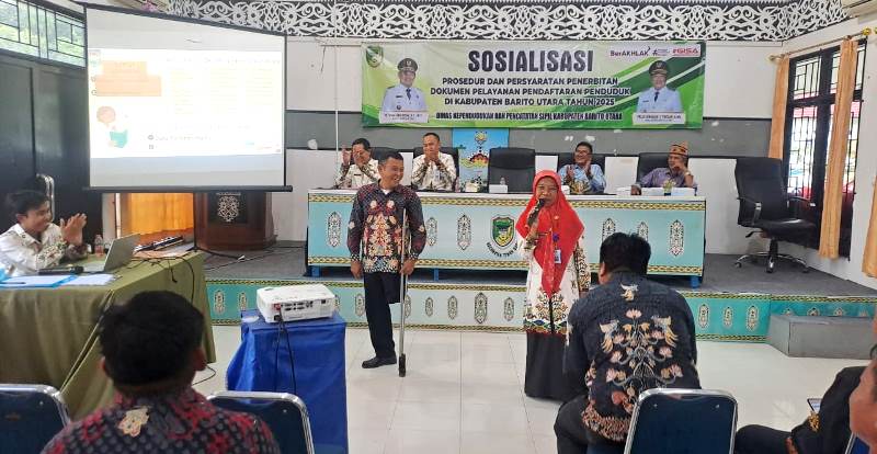 WARTABARITO.ID, Muara Teweh- Dalam upaya meningkatkan cakupan kepemilikan dokumen administrasi kependudukan di wilayah Kabupaten Barito Utara, Dinas Kependudukan dan Pencatatan Sipil (Disdukcapil) Barito Utara menggelar kegiatan Sosialisasi Prosedur dan Persyaratan Penerbitan Dokumen Pelayanan Pendaftaran Penduduk di Aula Kecamatan Teweh Baru, Kamis (16/10/2025).
