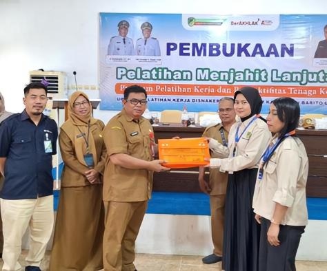 PELATIHAN MENJAHIT LANJUTAN - Kepala Dinas Nakertranskop UKM Barito Utara, M Mastur, menyerahkan materi pelatihan di aula Dinas Nakertranskop UKM setempat, Selasa (14/4/2026). (WB:Dok Disnakertranskop UKM)