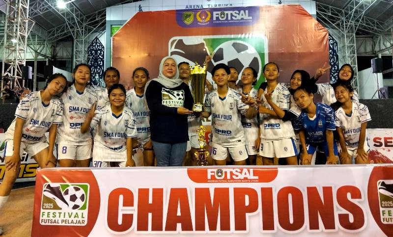 JUARA FESTIVAL FUTSAL PELAJAR 2025- Staf Ahli Bupati Bidang Politik dan Hukum, Drs H Ardian didampingi Ketua AFK Barito Utara sekaligus Ketua KONI Hj Henny Rosgiaty Rusli menyerahkan piala kepada juara Festival Futsal Antar Pelajar SMA sederajat se Barito Utara, Senin malam (20/10/2025).(wartabarito:ist)