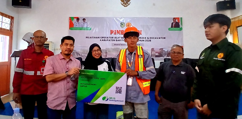 PESERTA TERIMA APD DAN BPJS-Peserta pelatihan Operator Alat Berat dan Dump Truck Tahun 2026 menerima APD dan kartu peserta BPJS Ketenagakerjaan usai pembukaan pelatihan, Jumat (23/1/2026).(foto:WB)