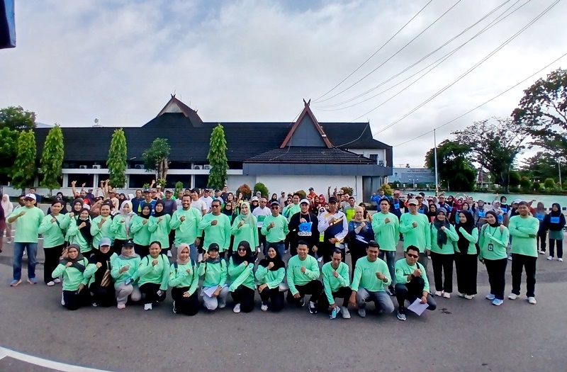 PEMBUKAAN TES KEBUGARAN CJH-Kepala Dinas Kesehatan Barito Utara, Pariadi AR foto bersama usai membaca ka kegiatan pengukuran kebugaran jasmani bagi CJH Barito Utara di halaman Kantor bupati Barito Utara dan Arena Terbuka Tiara Batara, Minggu (12/4/2026).(foto:WB)