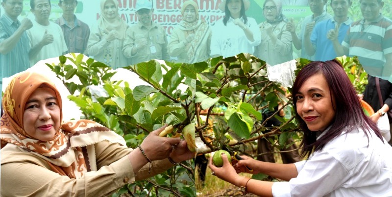 PANEN JAMBU KRISTAL: Ketua TP PKK Kabupaten Barito Utara Ny. Hj. Maya Savitri Shalahuddin bersama Ketua GOW Ny. Mira Apriantinada panen buah jambu kristal di kebun Kelompok Tani Karya Baru, Kelurahan Lanjas, Kamis (18/12/2025).(wartabarito:Dok Diskominfosandi Barut)