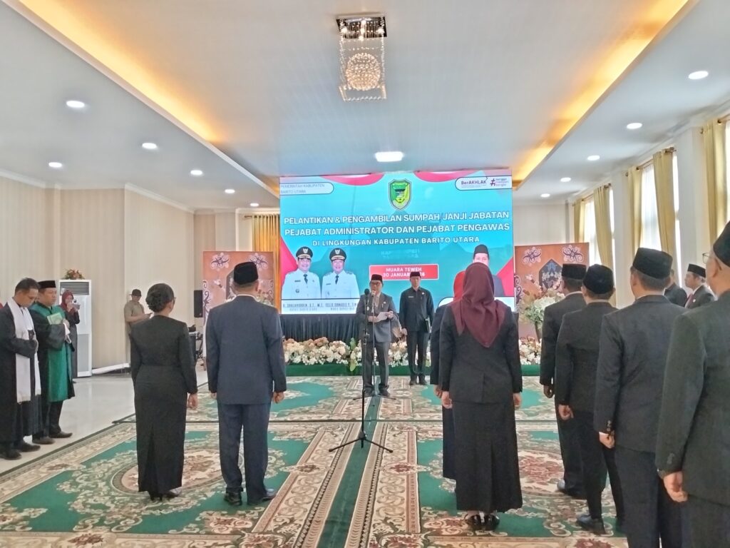WARTABARITO.ID, Muara Teweh – Pemerintah Kabupaten (Pemkab) Barito Utara melakukan pengisian sejumlah jabatan strategis melalui pelantikan sembilan pejabat administrator dan pengawas, Jumat (30/1/206) di Aula Rumah jabatan Bupati. Pelantikan yang dipimpin langsung oleh Bupati Barito Utara, H. Shalahuddin, ini juga menandai rotasi kepemimpinan di beberapa dinas, termasuk mutasi mengejutkan dari pimpinan rumah sakit daerah.