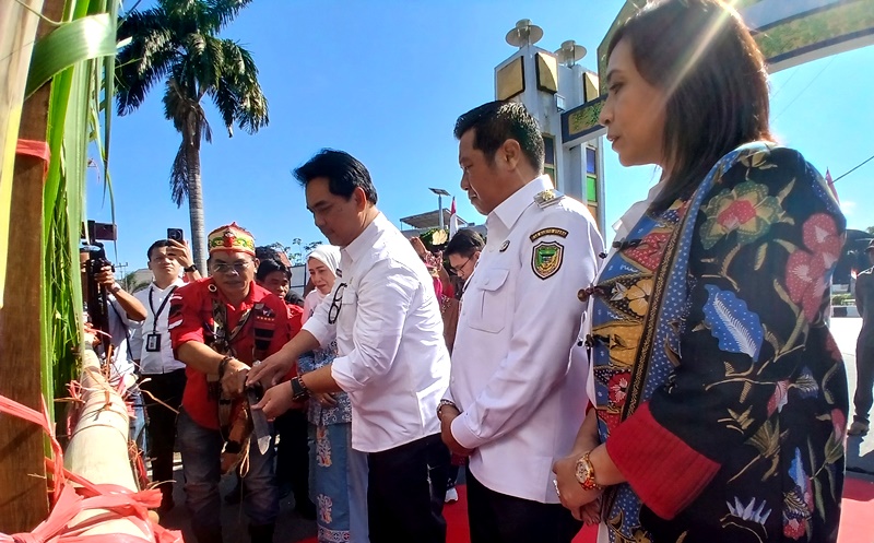 UPACARA ADAT-Bupati Barito Utara H Shalahuddin bersama istri didampngi Wakil Bupati Felix Sonadie Y Tingan bersama istri, disambut upacara adat potong Hompong memasuki rumah jabatan Bupati, Rabu (15/10/2025).(foto:wartabarito)